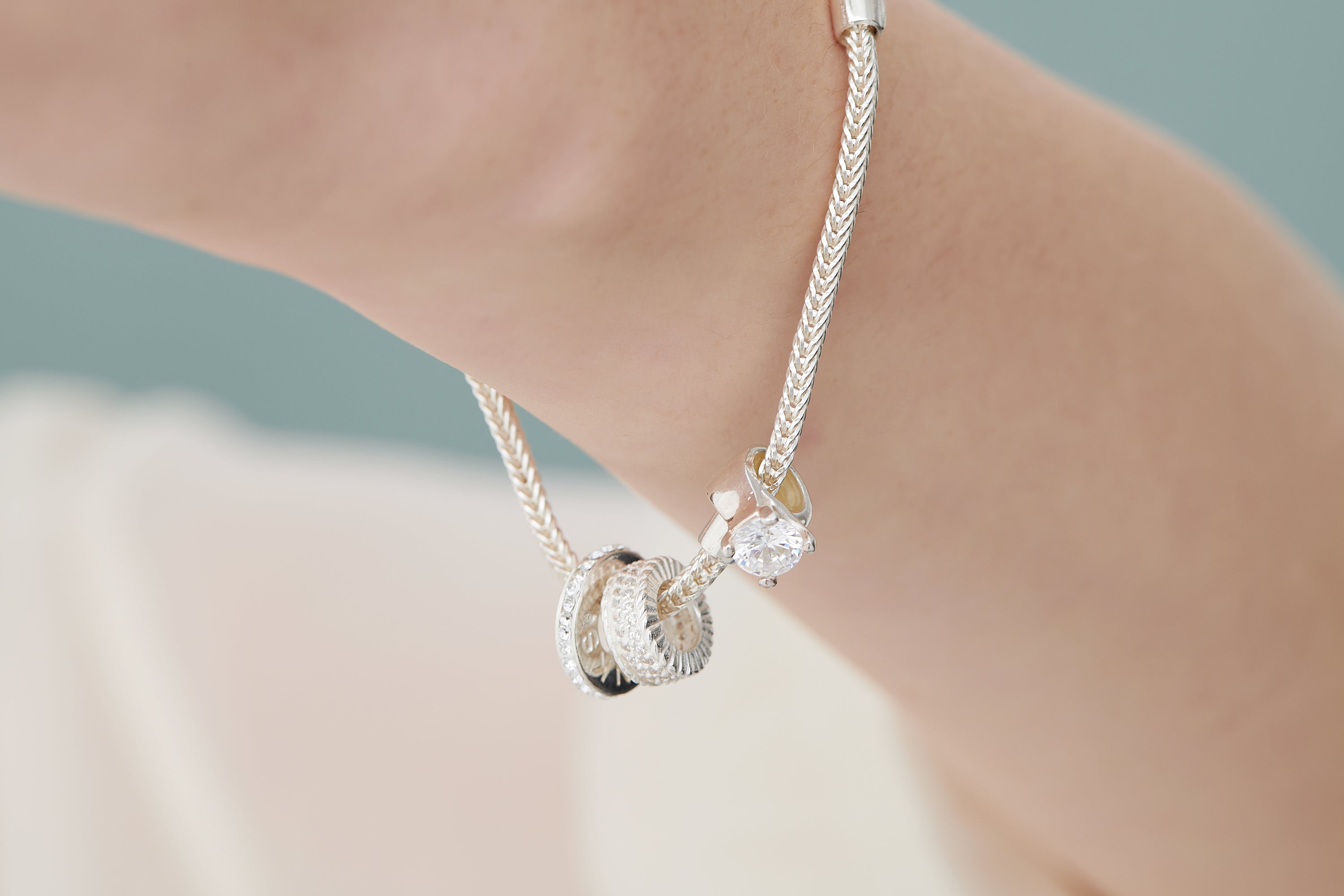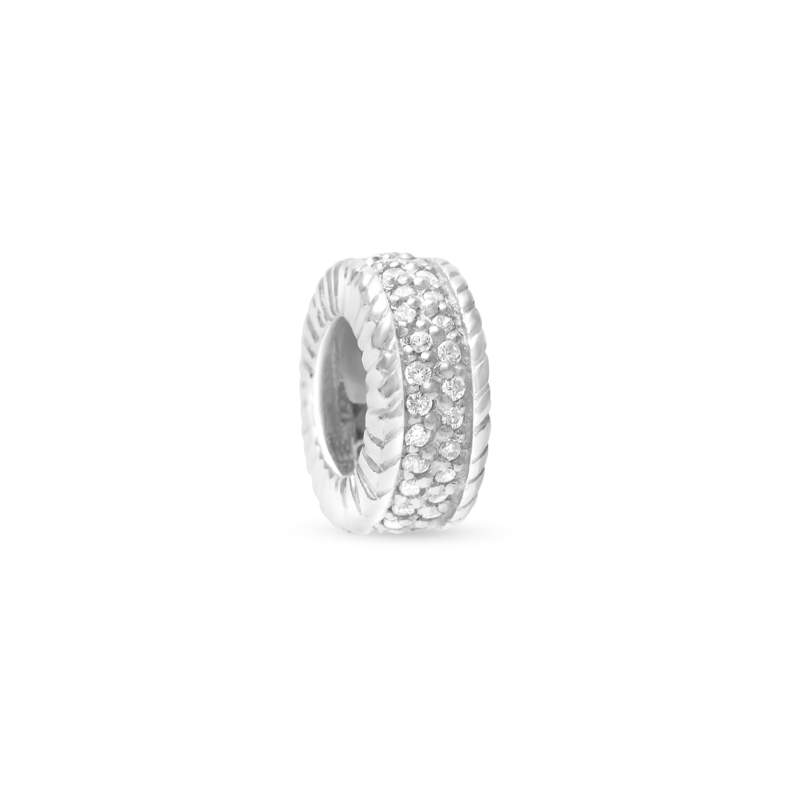 繊細な輝きの理由は驚くほど細かなキュービックジルコニアとそれを囲むスターリングシルバーの刻みの効果。控えめながら存在感のある端正なチャームです。
