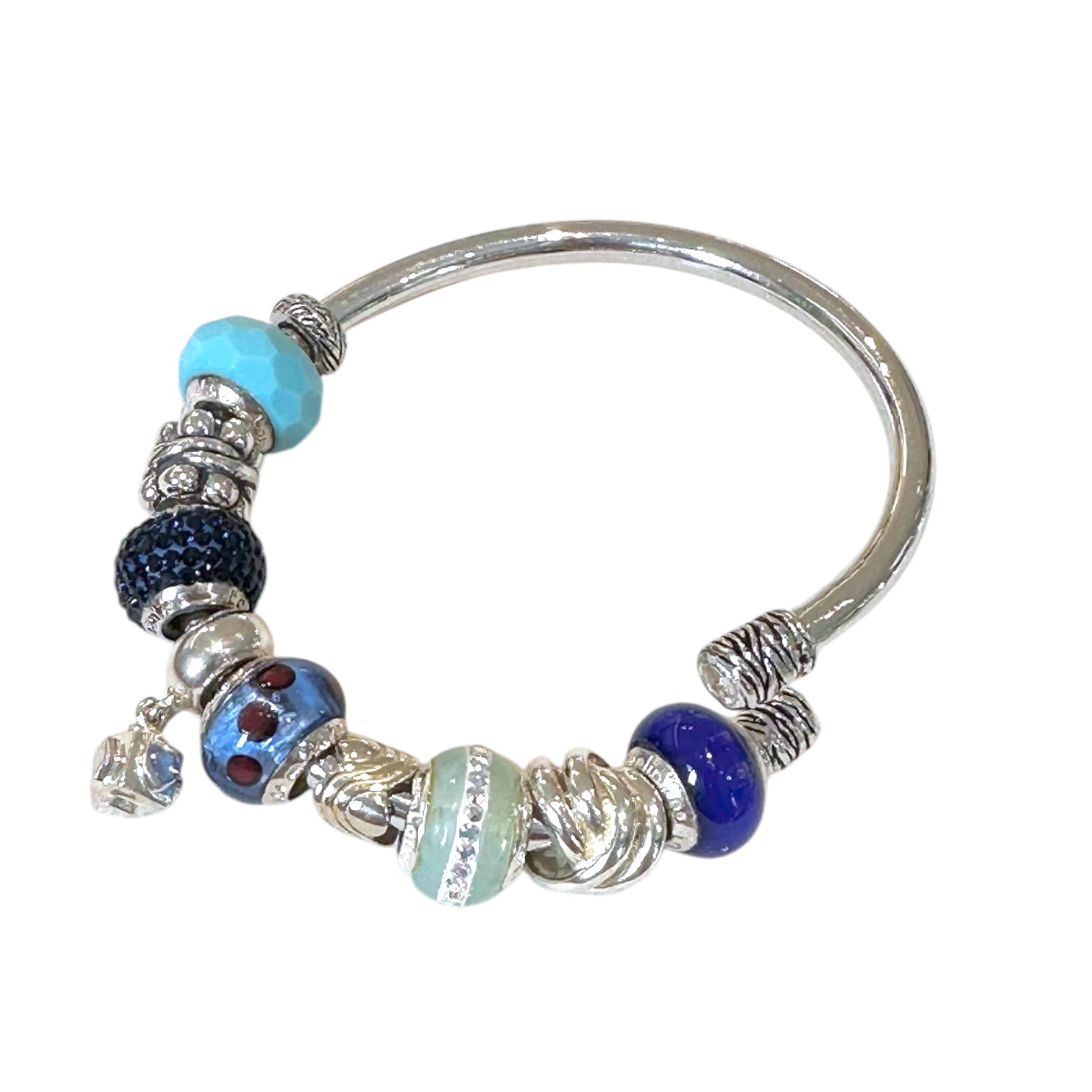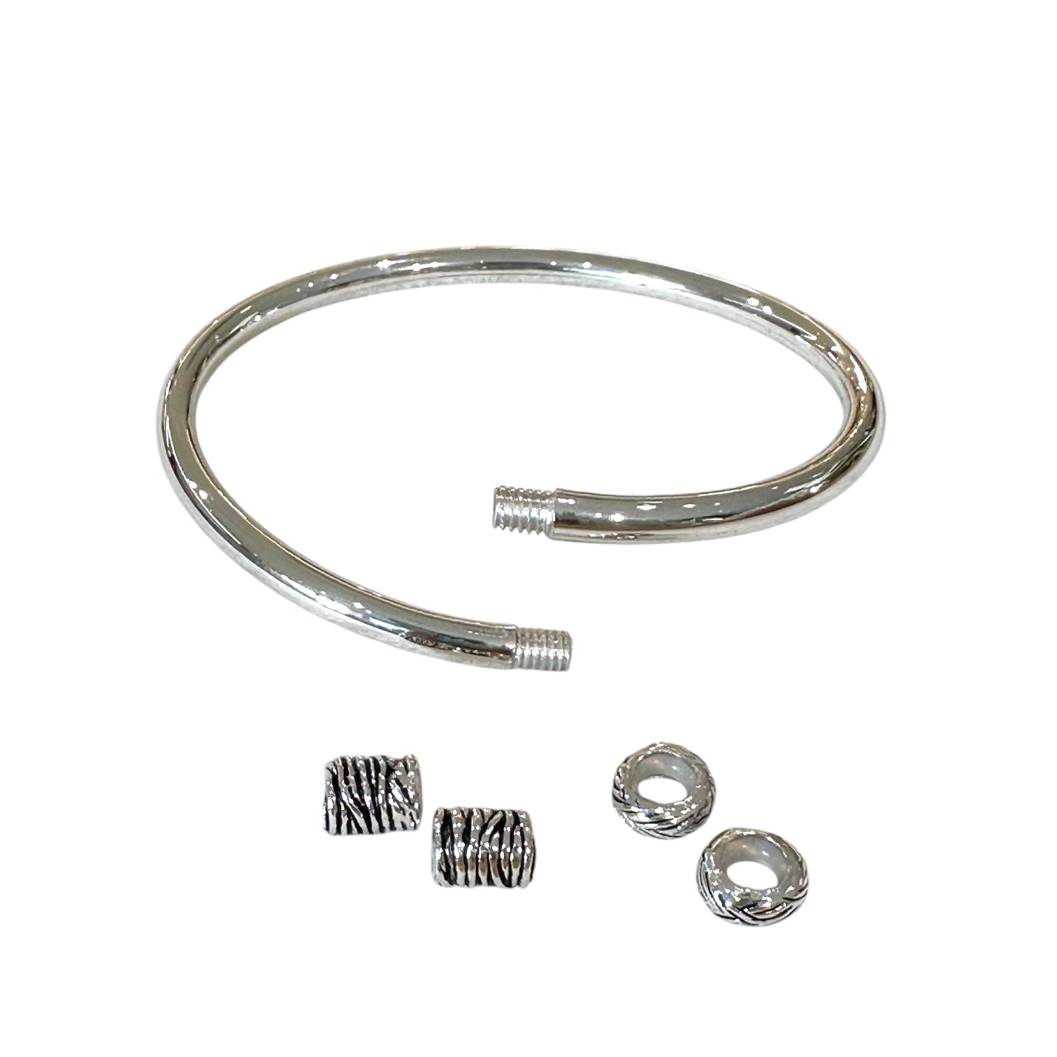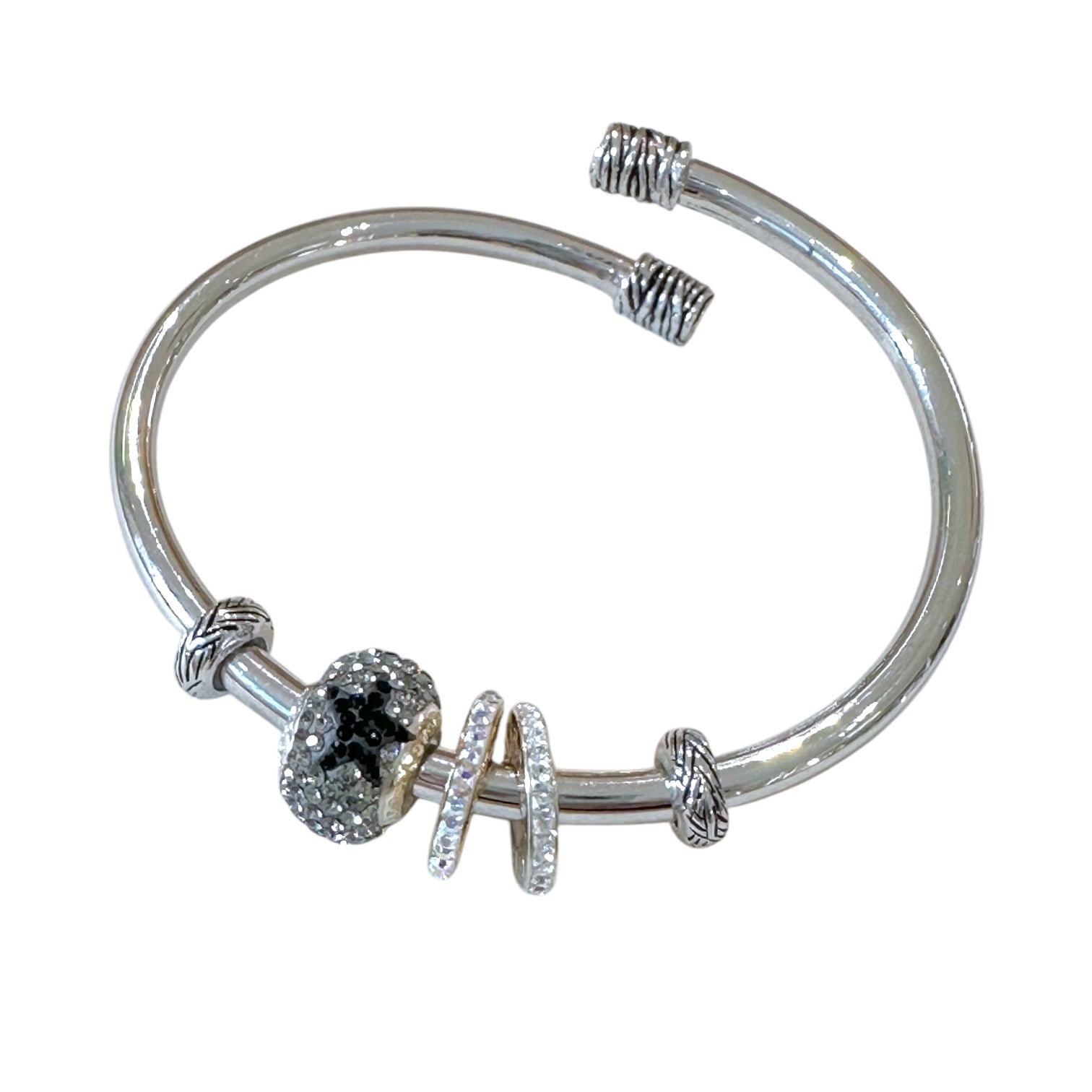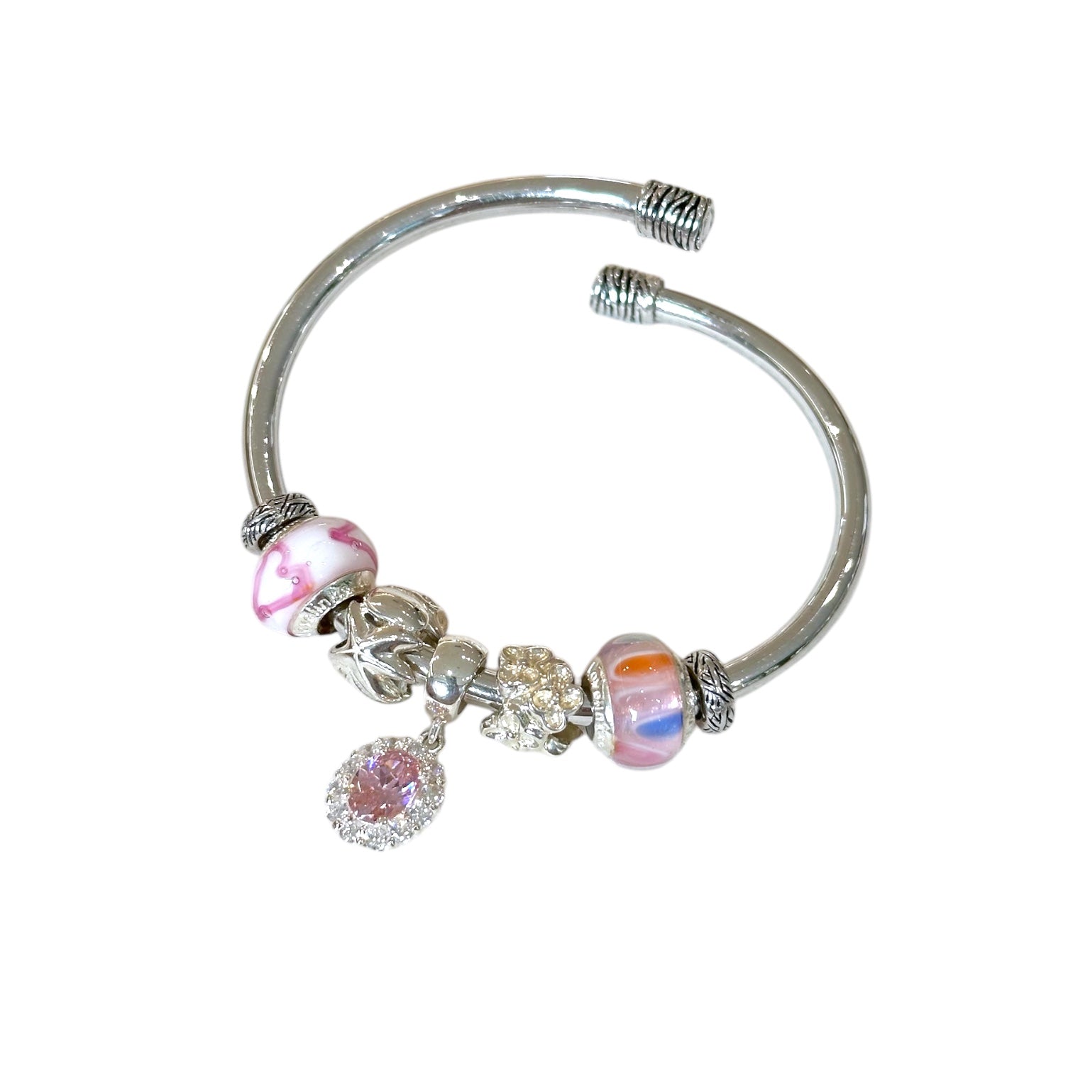 位置を自由に動かせて取り外しも可能なチャームストッパーの採用によりチャームを好きな位置で止められるから、よりパーソナルなバングルを作り上げることができます。