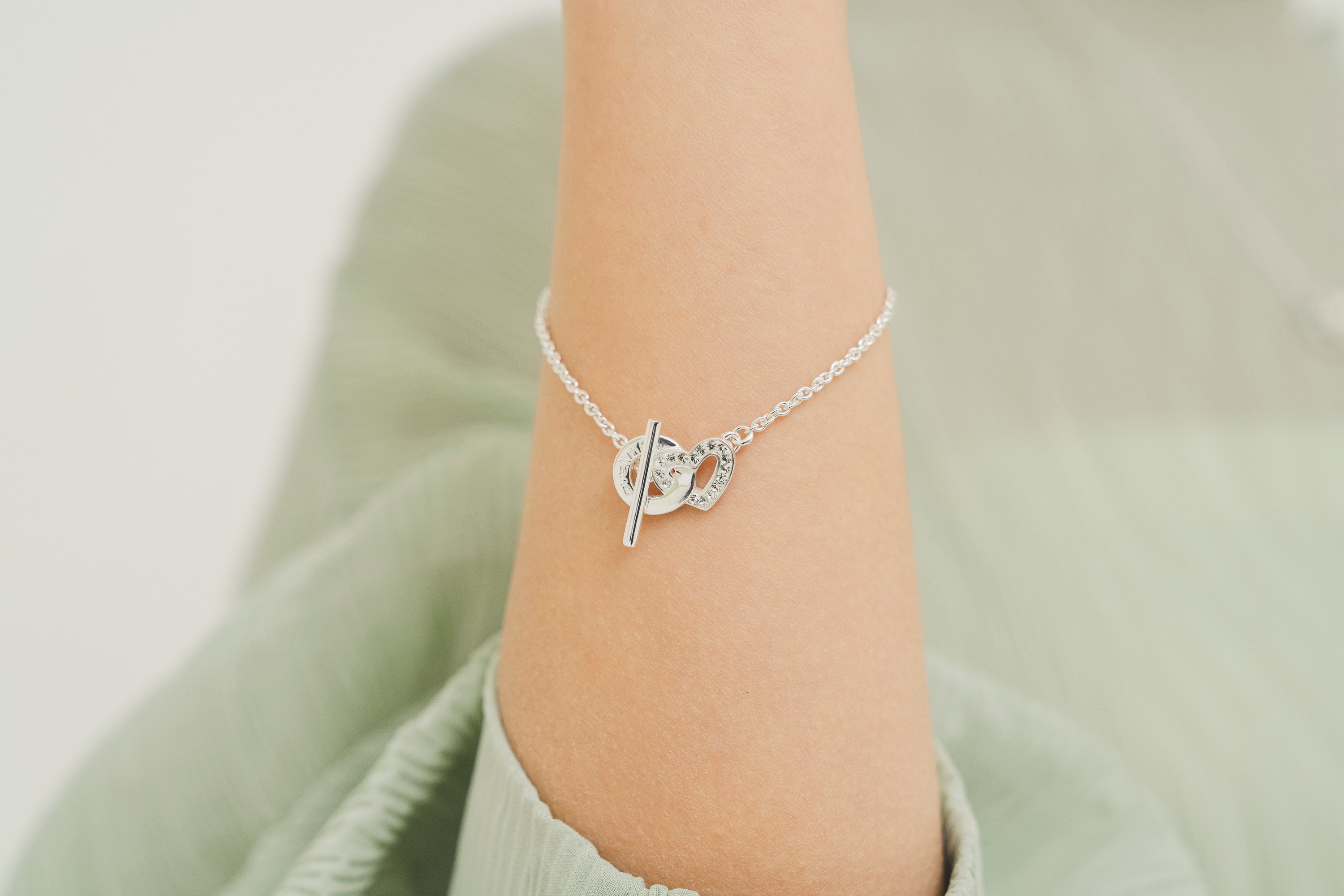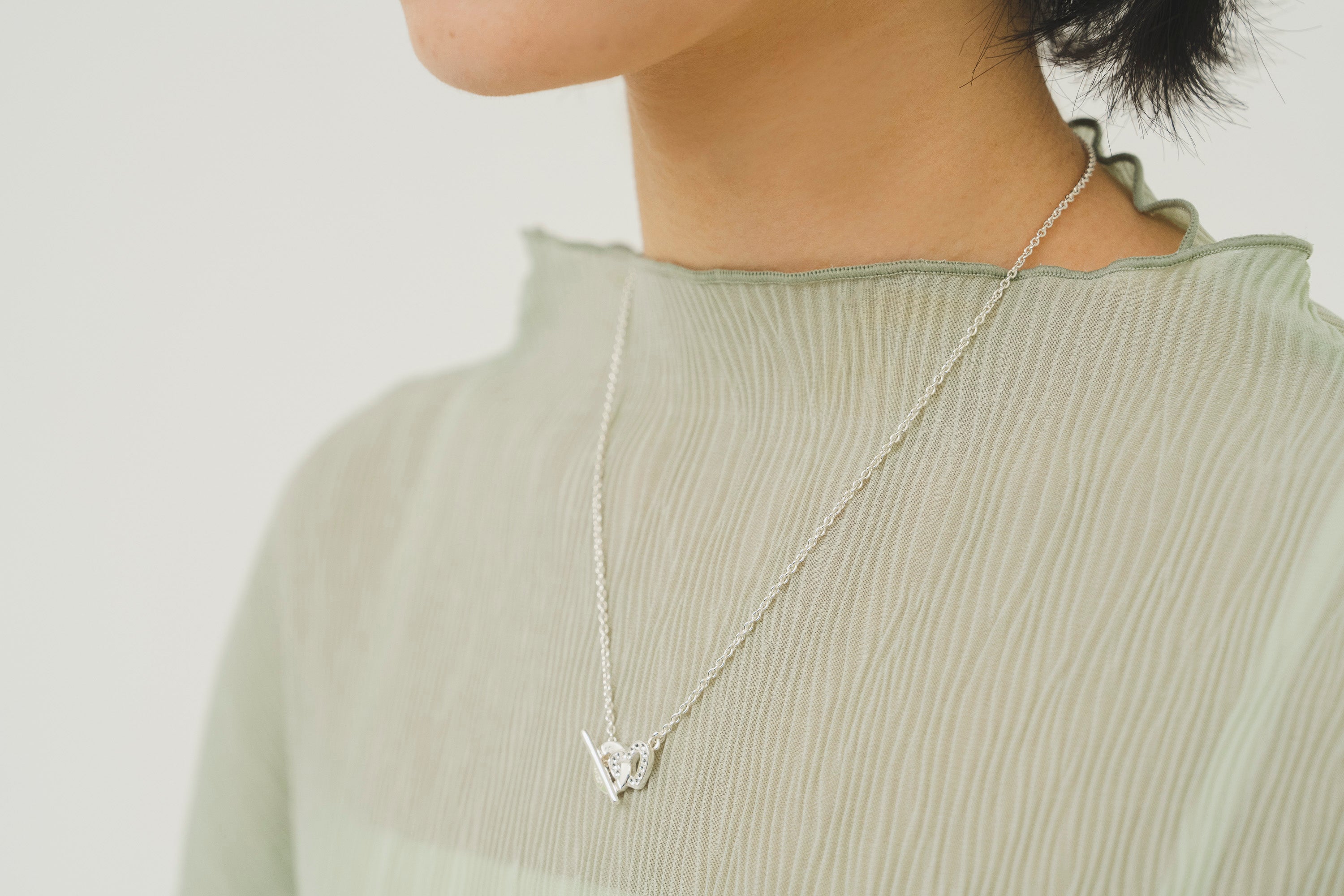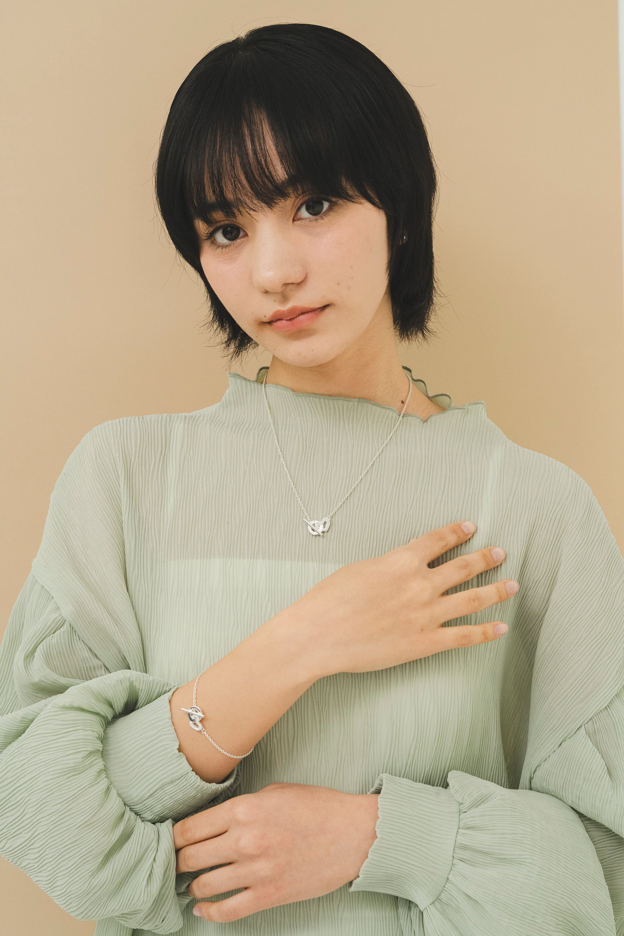 首周りにフィットするペンダントと女性らしさが際立つ華奢見えブレスレットとして。