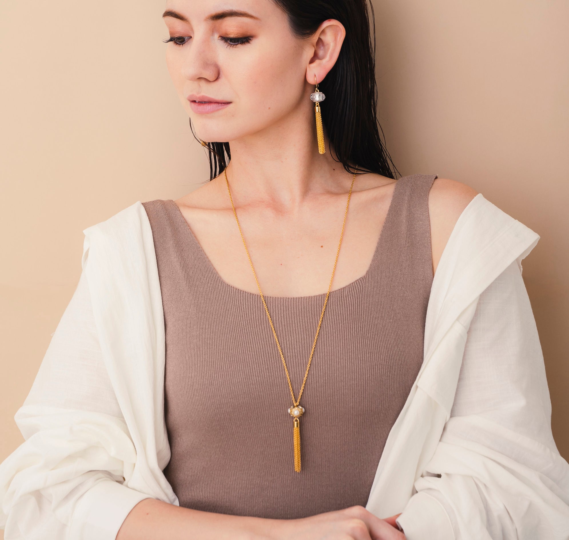 繊細なチェーンを束ねたタッセルが動くたびに優しく首に触れる肌触りと、大げさすぎず存在感のあるボリューム・長さにこだわった作品です。