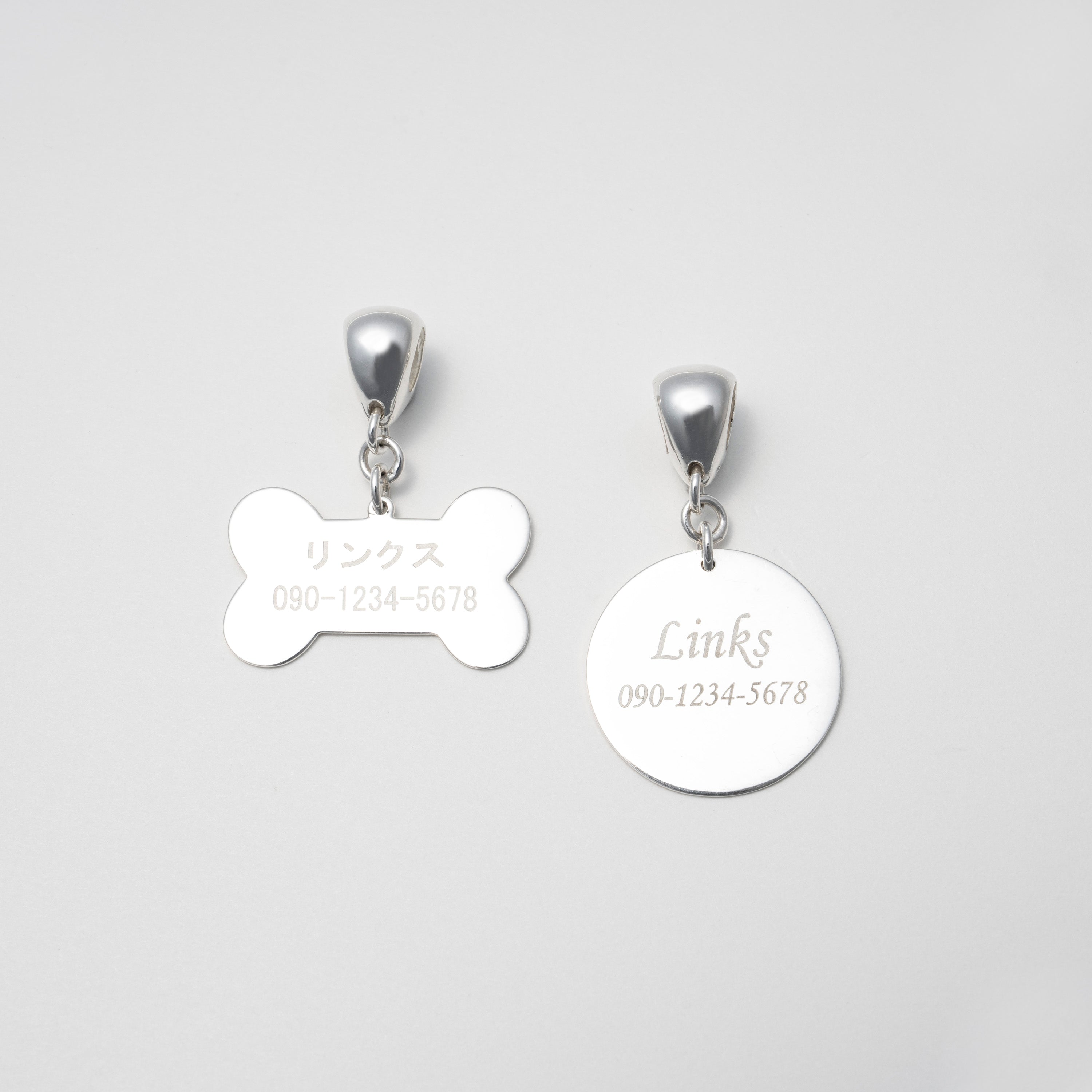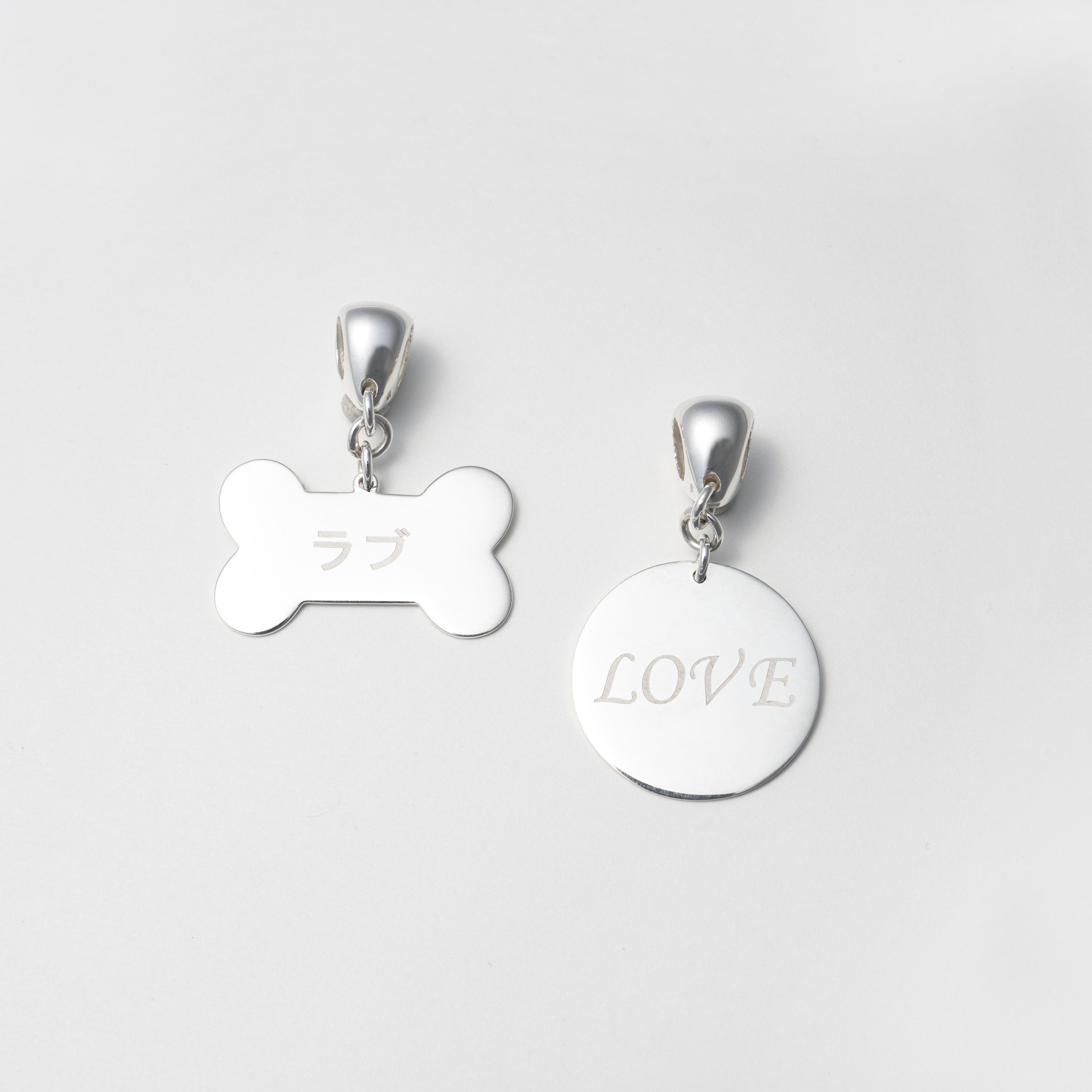 輝くスターリングシルバーのプレートにお名前や電話番号のほか、「叶えたい願い」「伝えたい想い」を刻んで身につけられるタグチャーム。 プレート表面、裏面に刻印が可能です。
