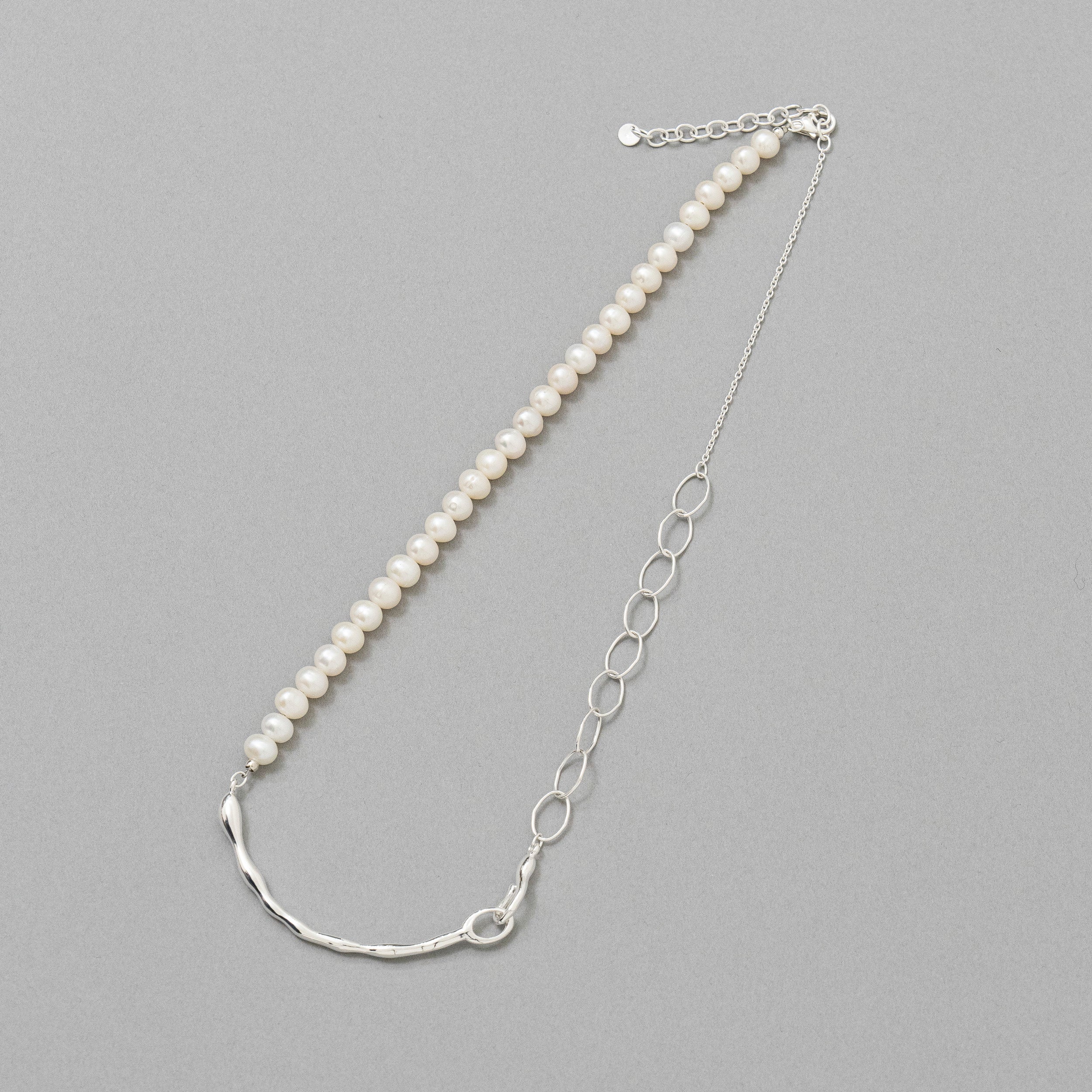 一粒一粒が個性豊かなパールたち・存在感のあるシルバー製珊瑚モチーフ・2パターンのチェーンを繋げた遊び心たっぷりのネックレスです。